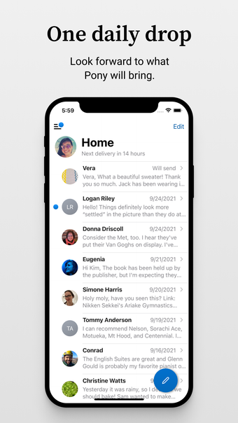 Pony Messenger is een unieke sociale netwerkmessenger voor iPhone die gebruikers een mindful communicatie-ervaring biedt. De app levert dagelijks berichten en zorgt ervoor dat je correspondentie niet wordt overspoeld door meldingen en andere afleidingen. Dit maakt het een ideale keuze voor gebruikers die op zoek zijn naar een georganiseerde en rustige manier van communiceren met vrienden en groepen.